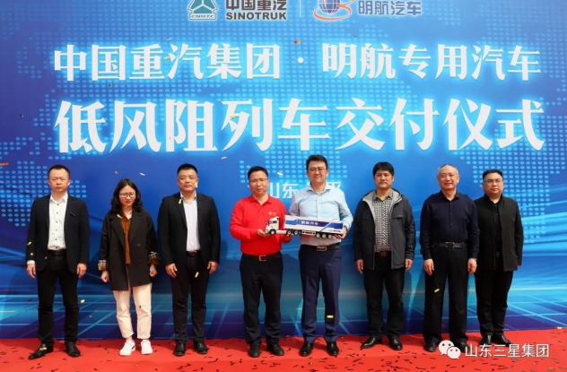 4月20日,中國重汽集團·明航專(zhuān)用汽車(chē)低風(fēng)阻列車(chē)交車(chē)儀式在山東三星機械制造有限公司隆重舉行。中國重汽集團相關(guān)領(lǐng)導,鋁谷產(chǎn)業(yè)技術(shù)研究院院長(cháng)雷浩,山東三星集團董事長(cháng)王明峰、副總經(jīng)理孫喜、山東三星機械制造有限公司總經(jīng)理張恒及集團相關(guān)部門(mén)主要負責人參加活動(dòng)。