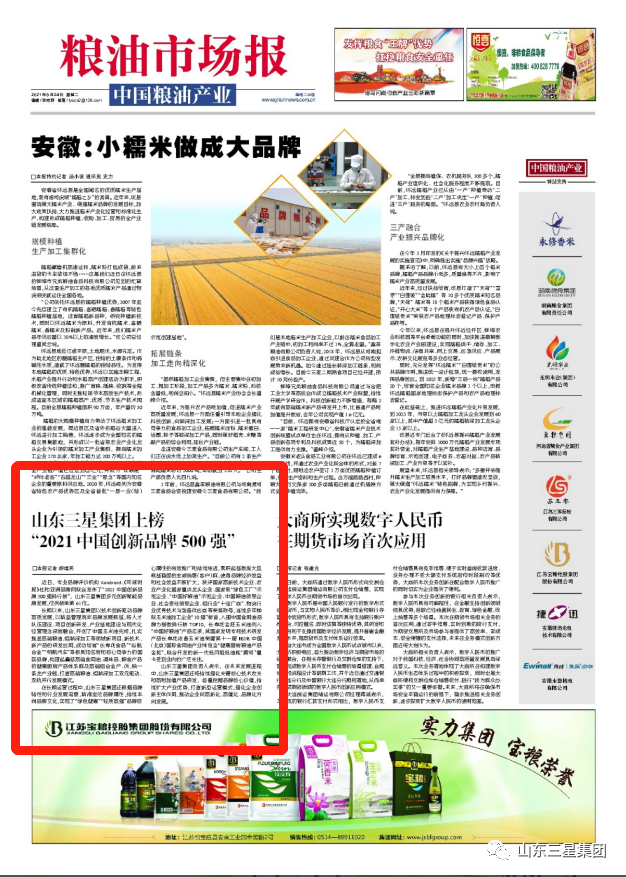 山東三星集團負責人表示,未來(lái),山東三星集團將繼續聚焦實(shí)業(yè),做精主業(yè),拓寬創(chuàng )新思維,增強創(chuàng )新能力和核心競爭力,推進(jìn)綠色低碳發(fā)展、數字化轉型發(fā)展,以產(chǎn)業(yè)高質(zhì)量發(fā)展助力鄉村振興,為山東經(jīng)濟社會(huì )發(fā)展貢獻民企新?lián)敗?原文刊登于2021年8月24日糧油市場(chǎng)報中國糧油產(chǎn)業(yè))