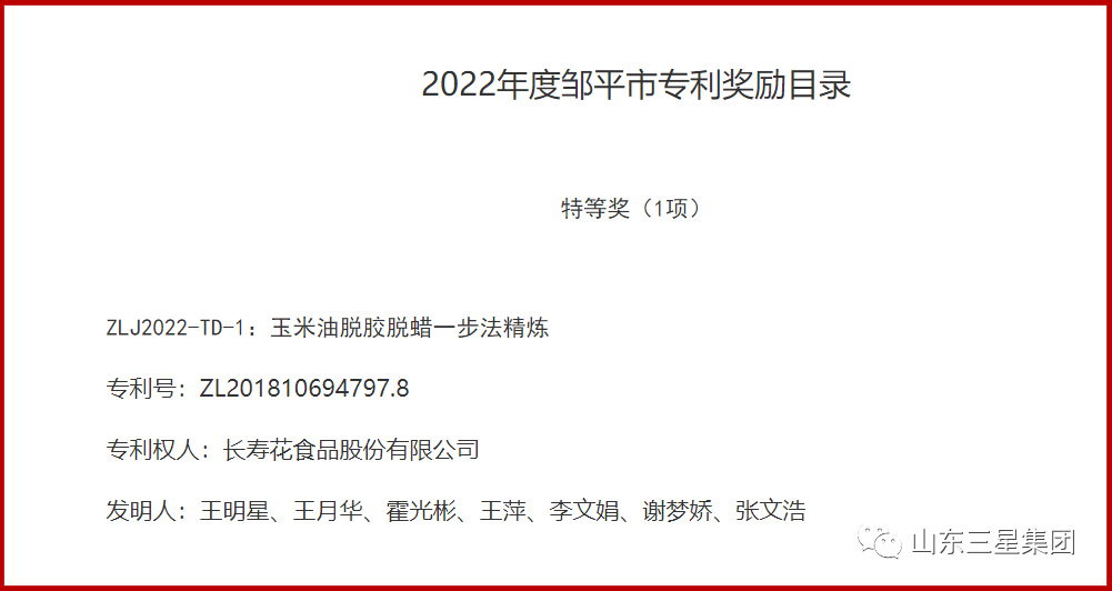其中,長(cháng)壽花食品“玉米油脫膠脫蠟一步法精煉”專(zhuān)利項目斬獲鄒平市專(zhuān)利獎特等獎;裕航合金公司“一種高速常導磁懸浮列車(chē)用軌排感應板的生產(chǎn)方法”、機械公司“一種地板與橫梁一體式集裝箱”專(zhuān)利項目分獲鄒平市專(zhuān)利獎二等獎。