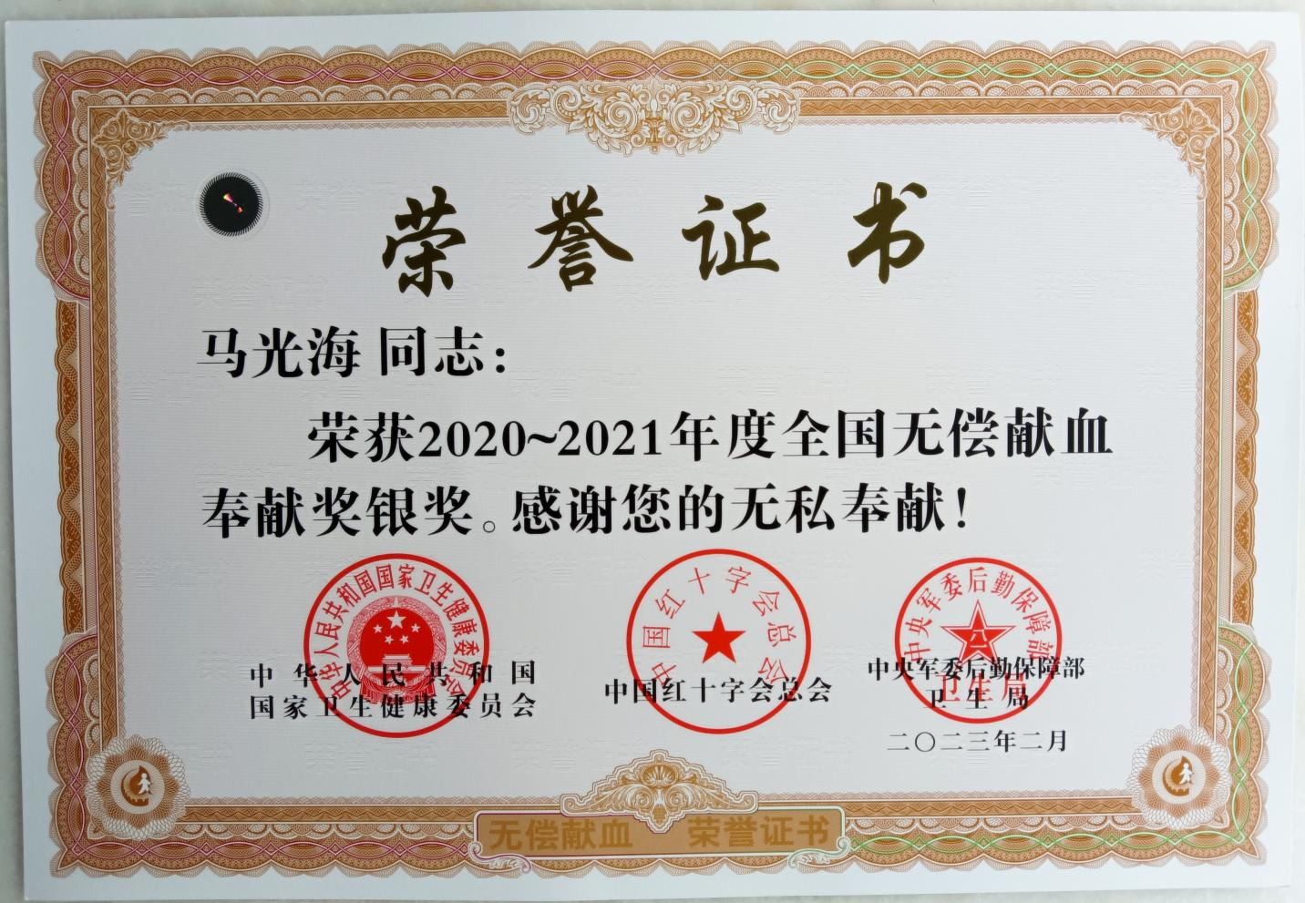 無(wú)償獻血,讓愛(ài)傳遞。7月14日,一份最有意義的榮譽(yù)證書(shū)發(fā)放到通遼公司行政副總經(jīng)理馬光海手中,他因無(wú)私獻血榮獲2020—2021年度全國無(wú)償獻血奉獻獎銀獎。