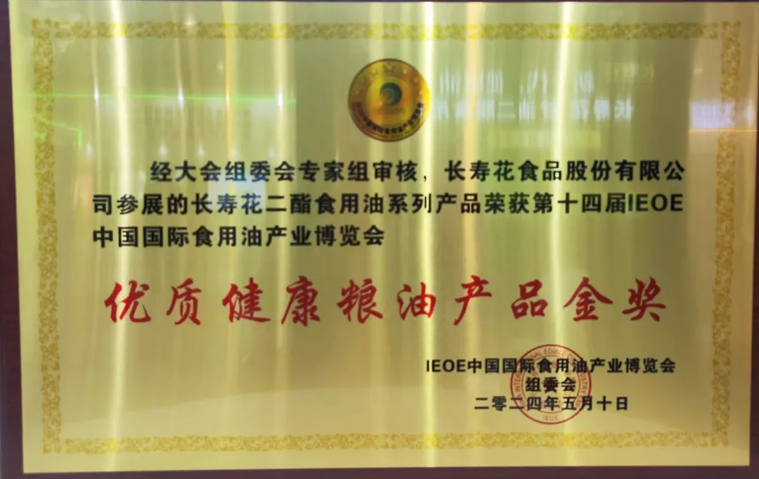 在萬(wàn)眾矚目的第十四屆IEOE中國油博會(huì )、IGPE中國糧油展上,長(cháng)壽花二酯食用油憑借卓越品質(zhì)與專(zhuān)業(yè)研發(fā)理念,榮耀加冕“優(yōu)質(zhì)健康糧油產(chǎn)品金獎”!“優(yōu)質(zhì)健康糧油產(chǎn)品金獎”不僅是對長(cháng)壽花二酯食用油的肯定,也是對長(cháng)壽花食品長(cháng)期以來(lái)致力于推動(dòng)食用油行業(yè)健康發(fā)展努力的認可。這份榮譽(yù),凝聚了長(cháng)壽花全體同仁的智慧與汗水,是團隊合作精神的結晶,更是對健康生活倡導的有力回應。