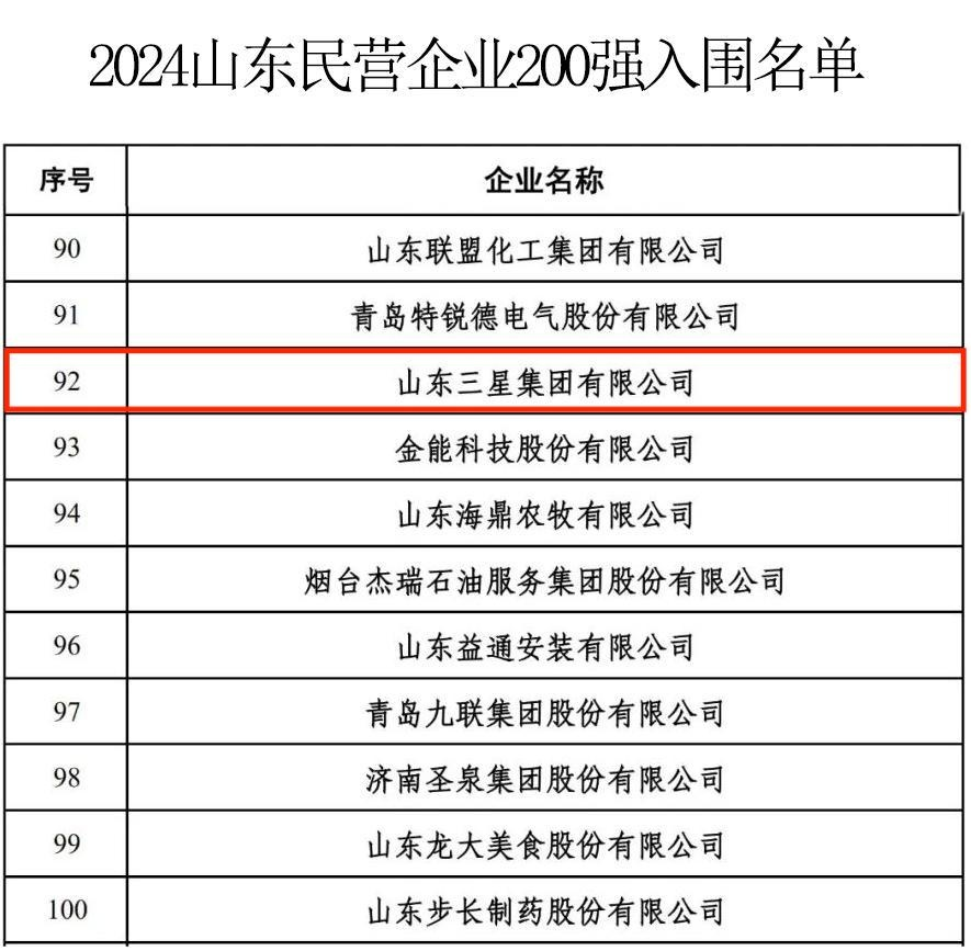 近日,山東省工商聯(lián)公示了2024山東民營(yíng)企業(yè)百強系列榜單入圍名單。山東三星集團憑借雄厚的產(chǎn)業(yè)實(shí)力、強勁的發(fā)展潛力和廣闊的市場(chǎng)前景,入圍2024山東民營(yíng)企業(yè)200強名單。