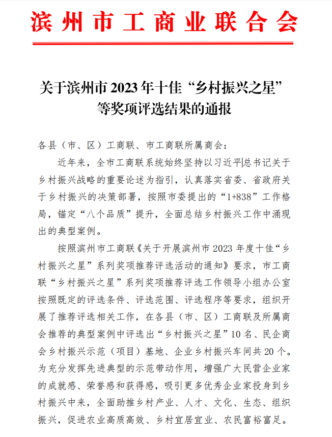 近期,濱州市工商聯(lián)發(fā)布《關(guān)于濱州市2023年十佳“鄉村振興之星”等獎項評選結果的通報》,山東三星集團董事長(cháng)、總裁王亞群榮獲濱州市2023年十佳“鄉村振興之星”榮譽(yù)稱(chēng)號。