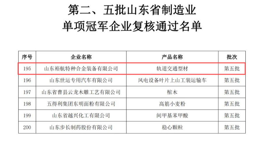 近日,省工信廳公布《第八批山東省制造業(yè)單項冠軍企業(yè)和通過(guò)復核的第二、五批制造業(yè)單項冠軍企業(yè)名單》,山東裕航特種合金裝備有限公司憑借“軌道交通型材”成功通過(guò)山東省制造業(yè)單項冠軍企業(yè)復核。
