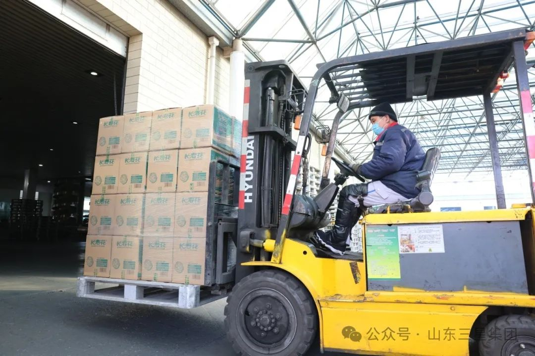 》》在長(cháng)壽花食品倉儲車(chē)間,叉車(chē)來(lái)回穿梭,緊鑼密鼓為客戶(hù)備貨。