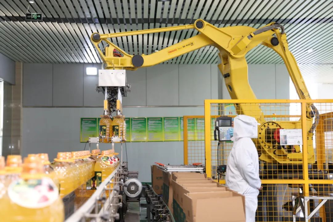 同樣,在長(cháng)壽花食品公司的車(chē)間內,也是一片熱火朝天的生產(chǎn)景象。全自動(dòng)生產(chǎn)線(xiàn)上,吹瓶、灌裝并封蓋、燈檢、貼標簽等工序一氣呵成。最后,智能機械臂一次抓取12桶油,放進(jìn)3個(gè)包裝箱,封裝后傳送至倉庫。