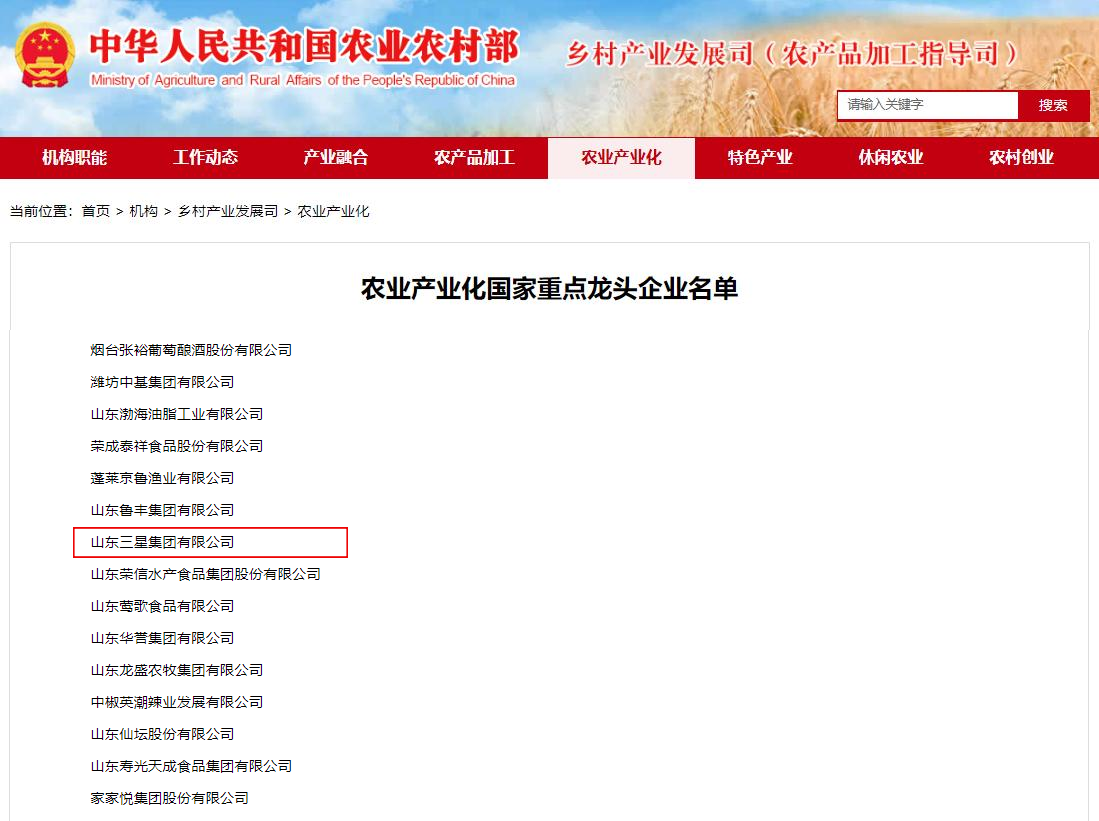 近日,農業(yè)農村部公布了新一批“農業(yè)產(chǎn)業(yè)化國家重點(diǎn)龍頭企業(yè)”名單,山東三星集團順利通過(guò)監測評估,自2011年通過(guò)認定以來(lái),已連續15年被認定為農業(yè)產(chǎn)業(yè)化國家重點(diǎn)龍頭企業(yè)。