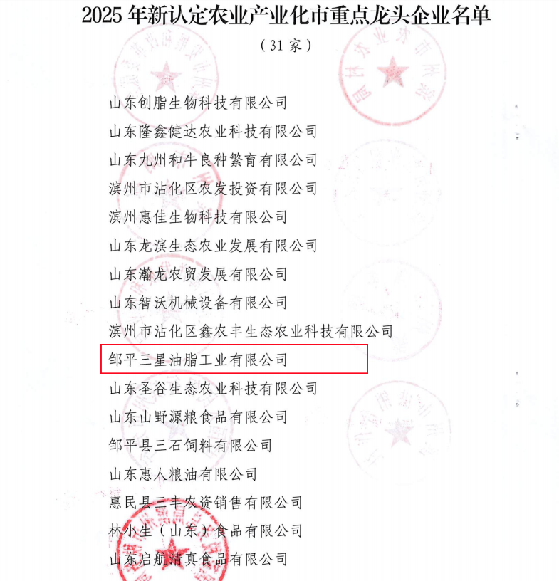 近日,濱州市農業(yè)農村局等聯(lián)合發(fā)布了2025年新認定農業(yè)產(chǎn)業(yè)化市重點(diǎn)龍頭企業(yè)名單,鄒平三星油脂工業(yè)有限公司憑借其在糧油加工領(lǐng)域的卓越實(shí)力和行業(yè)領(lǐng)先地位,入選該名單。