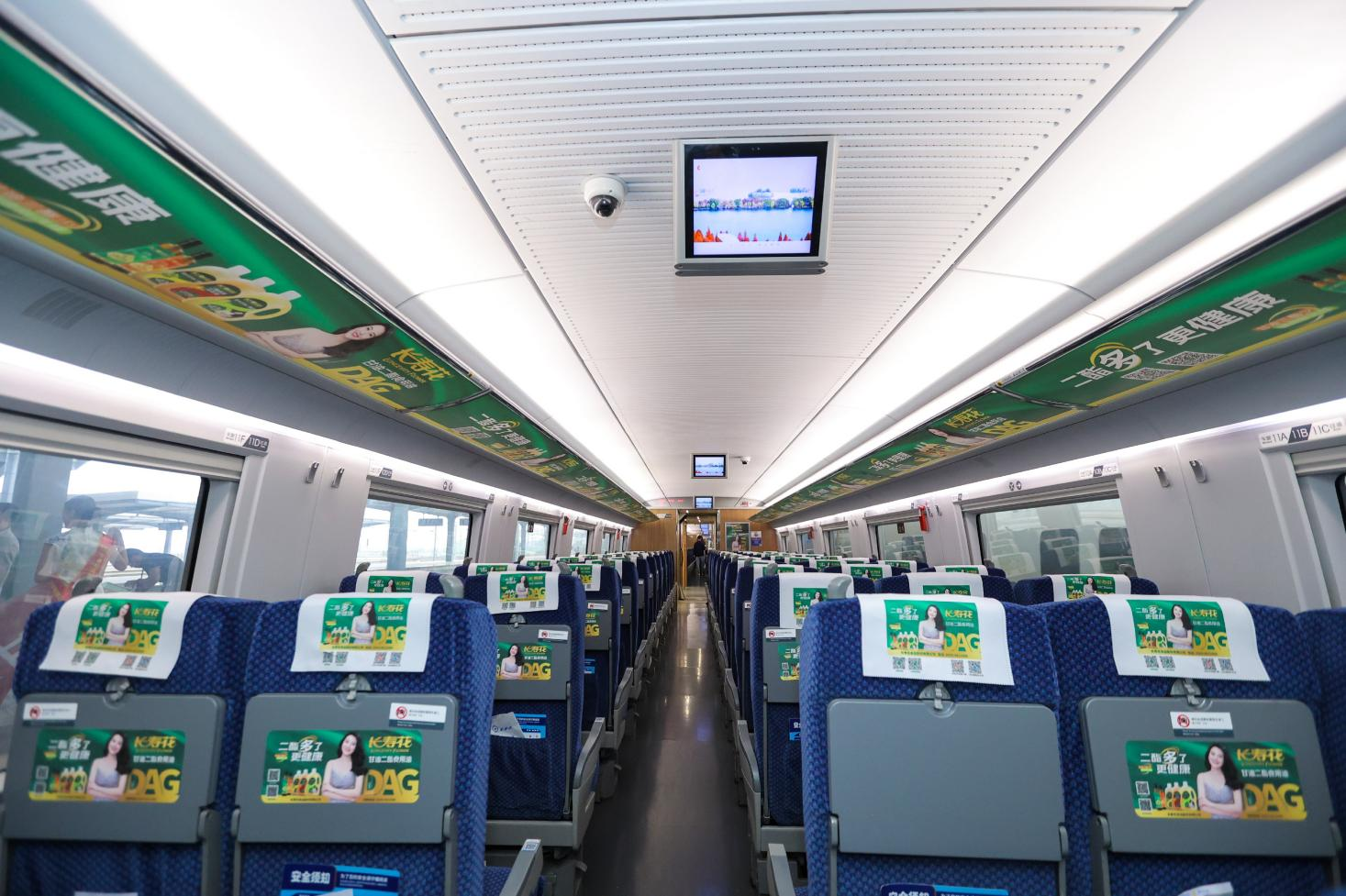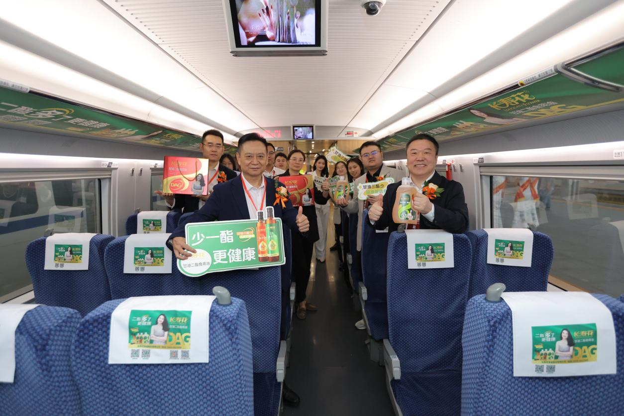 儀式結束后,與會(huì )領(lǐng)導一行到達站臺,與“長(cháng)壽花甘油二酯食用油號”高鐵列車(chē)合影,并登上首發(fā)班次冠名列車(chē),實(shí)地感受品牌與高鐵場(chǎng)景的深度融合。列車(chē)內部構建了以小桌板、頭巾、行李架、海報、字幕等為點(diǎn)位的品牌傳播矩陣,形成360°環(huán)繞式品牌空間。